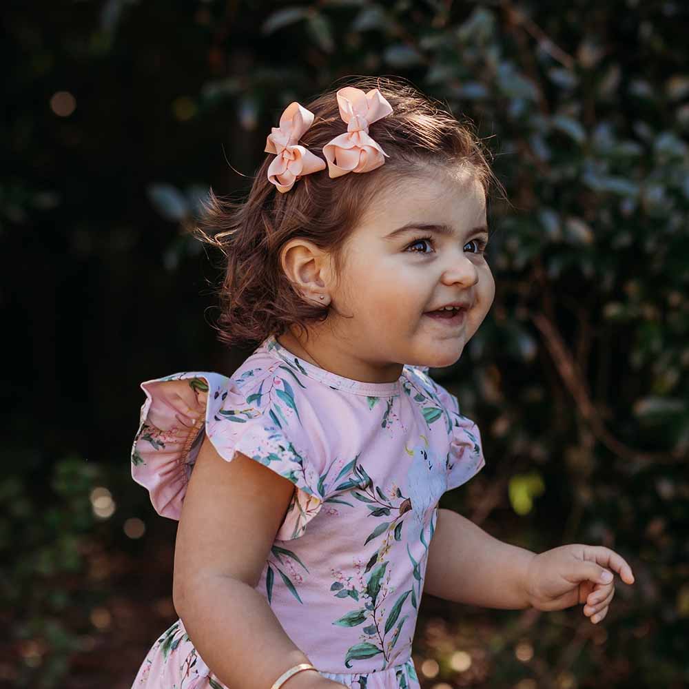 Our Snuggle Hunny Peach piggy tail hair clips come as a pair and are a great accessory to go with our organic dresses and clothing.