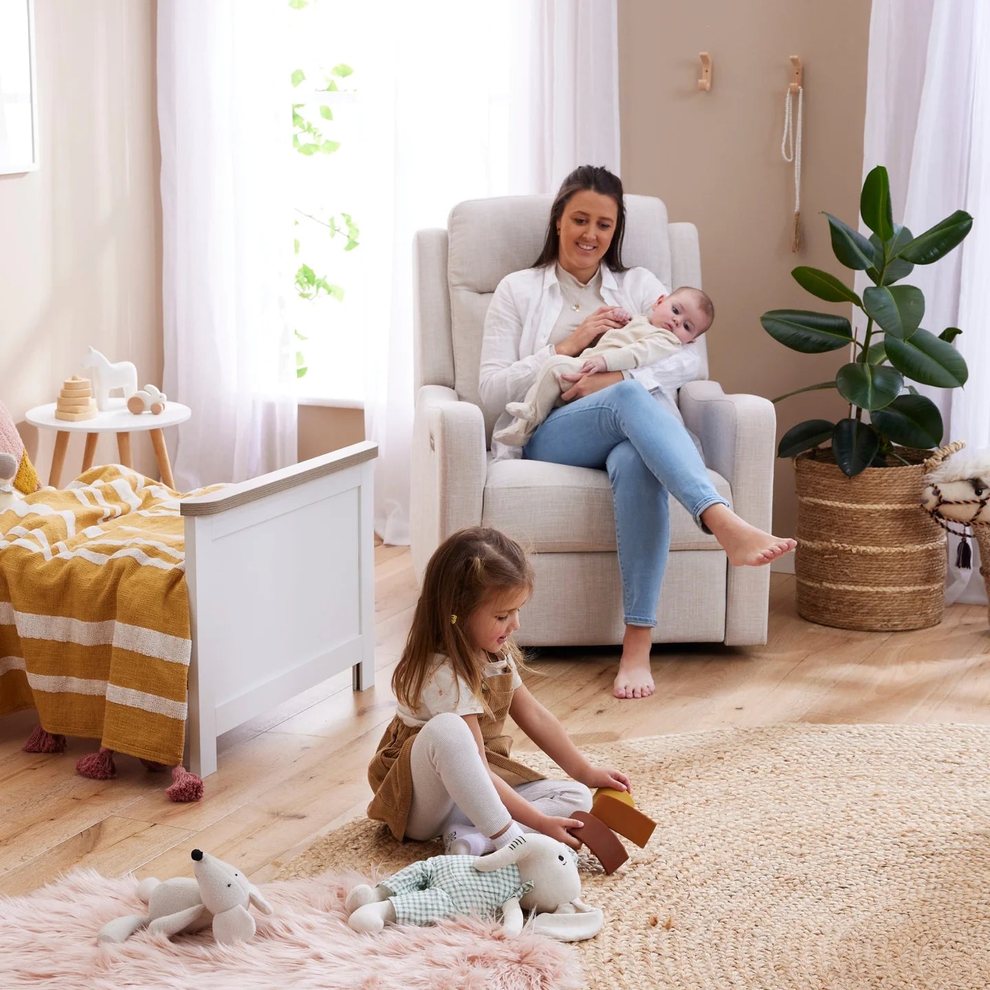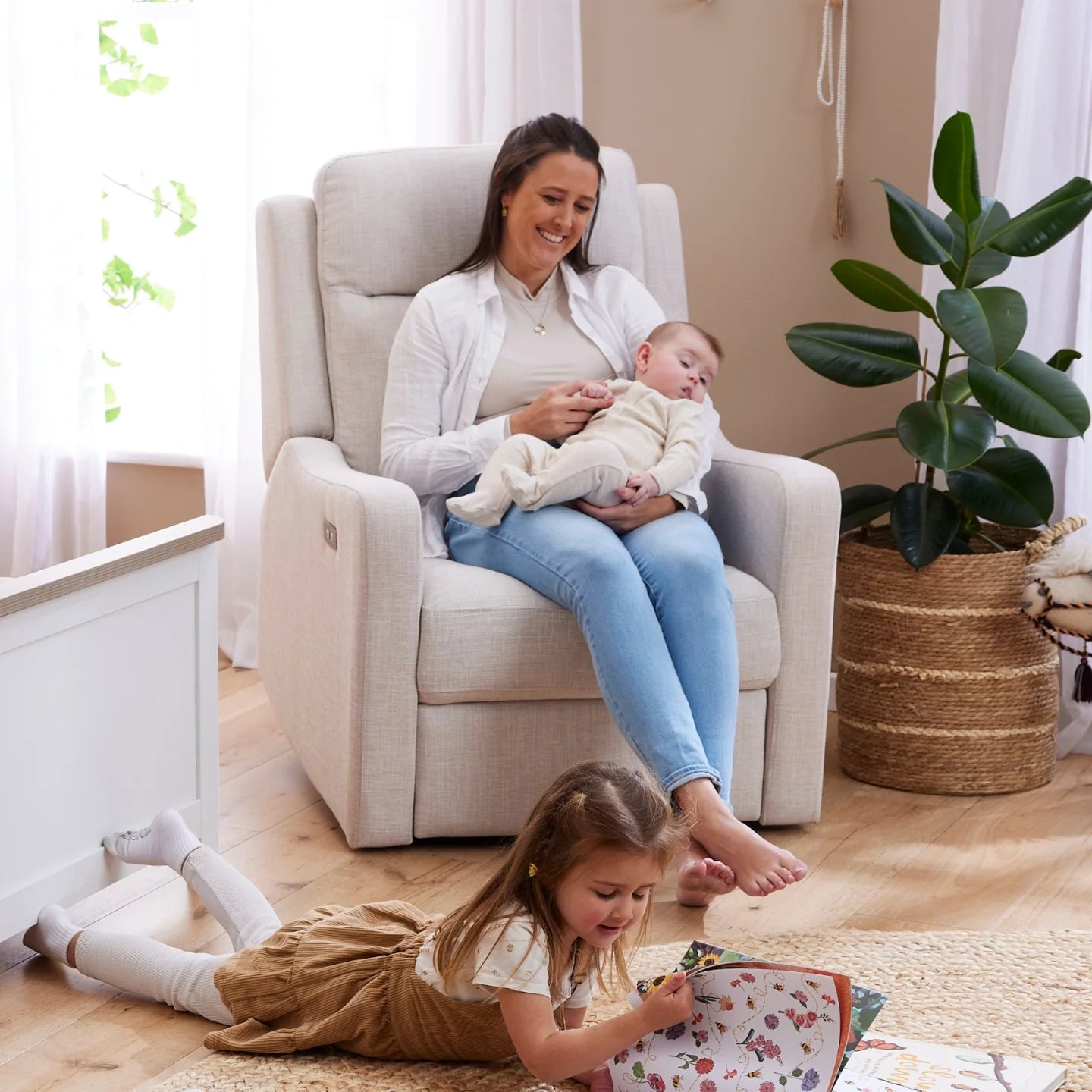 Let the world pass you by while you relax, unwind and recharge both your mind and your device with our Henry Electric Recliner Chair Eggshell. With a built-in charging port positioned on the outer armrest, Henry has been designed to support you and your baby during the fourth trimester.