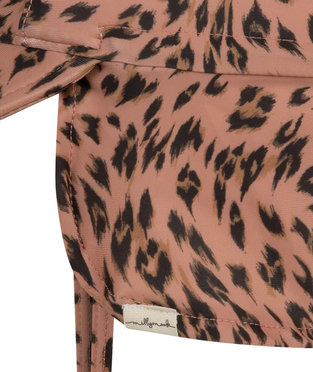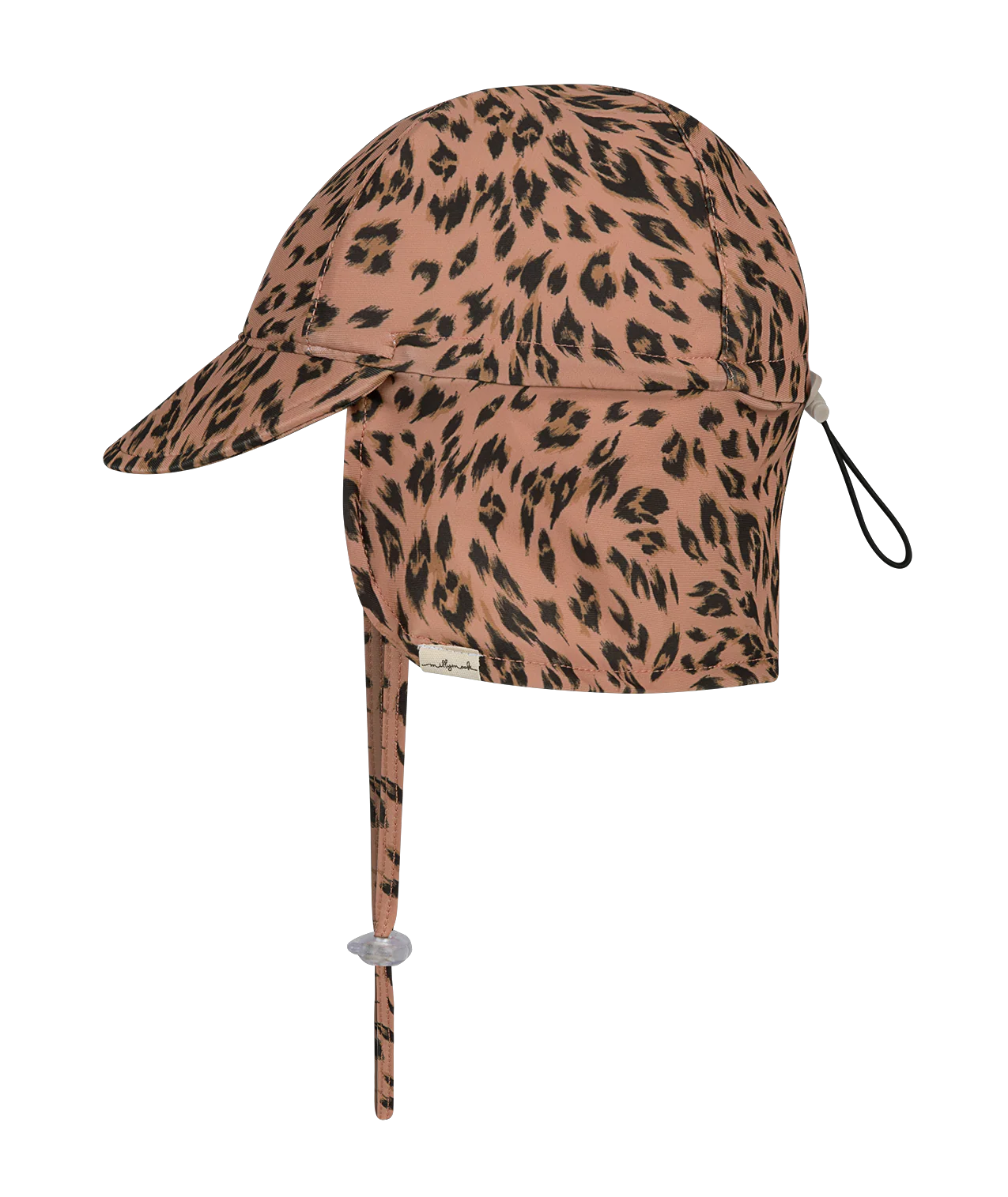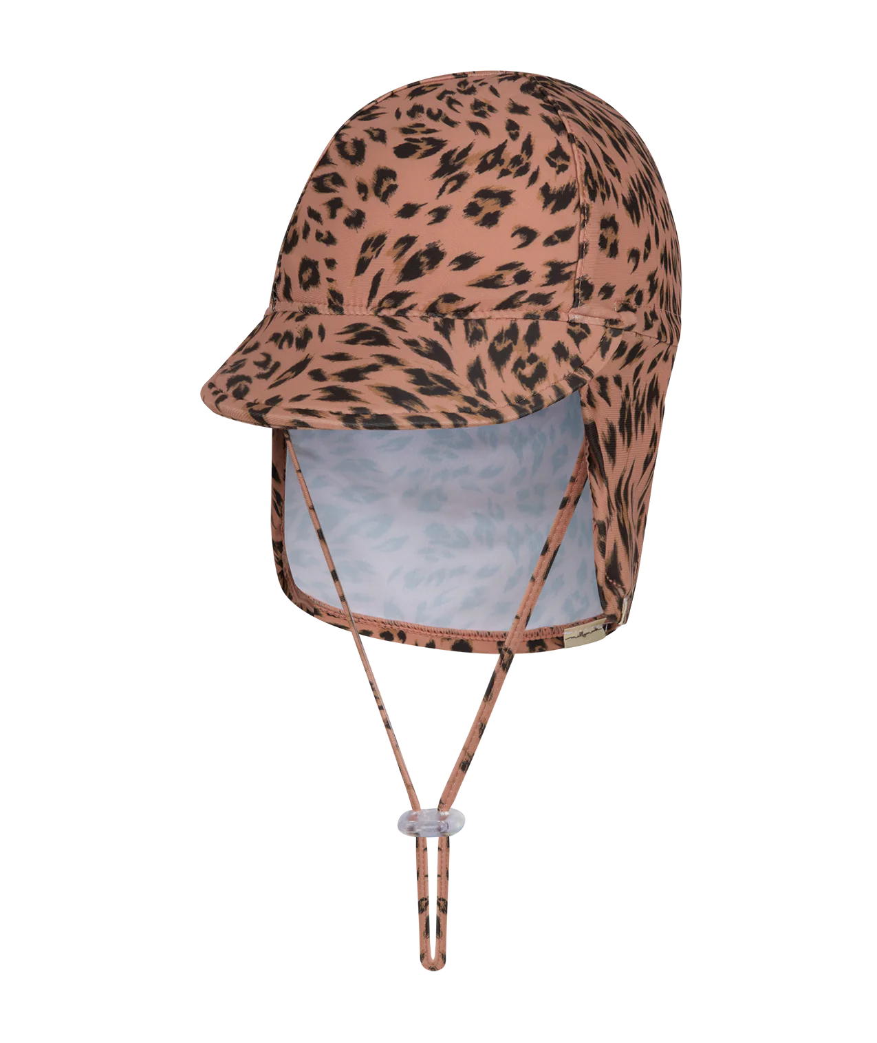The baby girls Chloe legionnaire style features a stylish leopard print design. This hat features the legionnaire flat, adjustable chin strap and a adjustable elastic back. It is made from a swim fabric making it quick dry and super comfy for your little one in the sun.