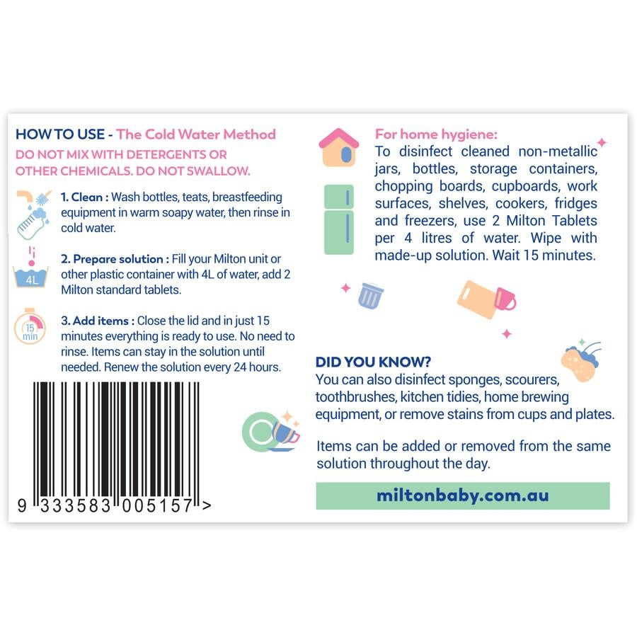 - Prepare Solution: Fill your Milton unit with 4L of water, add 2 Milton standard tablets.