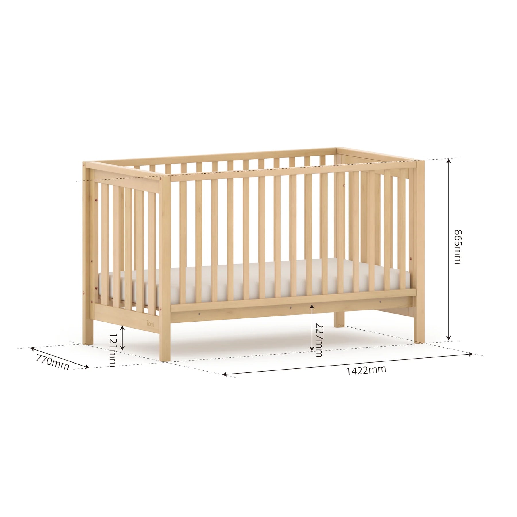 - Sturdy timber cot with a simple silhouette for to suit a range of nursery styles.