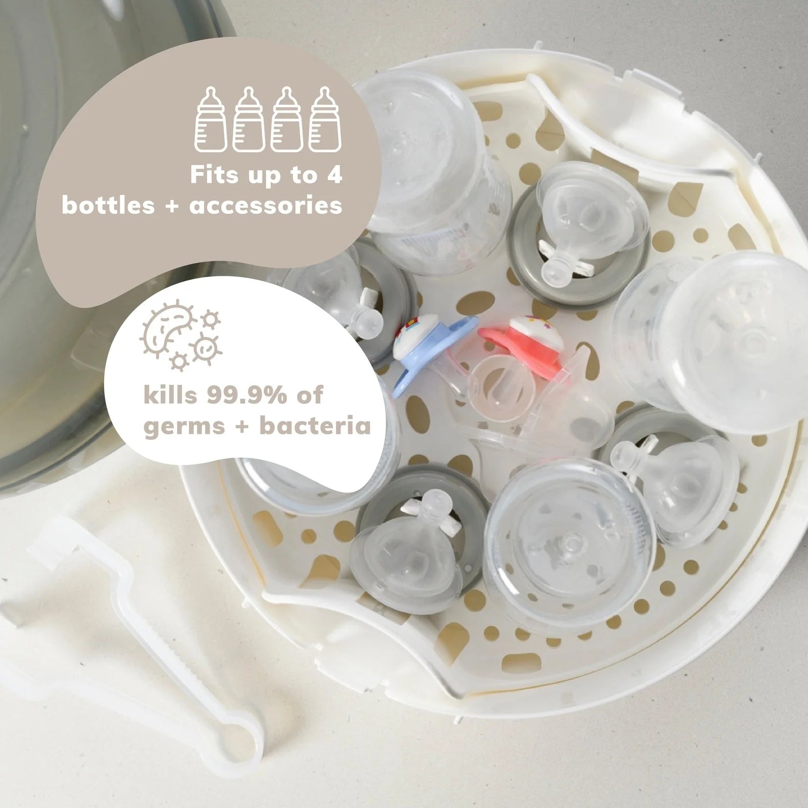 Fits Up to 4 Bottles + Accessories: Accommodates up to 4 bottles and accessories, making it versatile and efficient for thorough sterilisation.