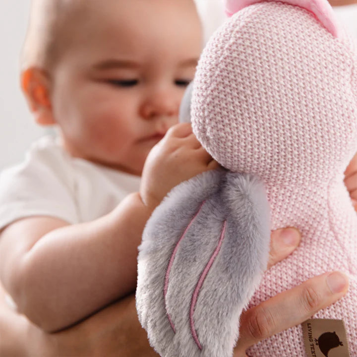 Beautifully crafted from mostly cotton with a pearl knit finish, they offer a lovely handcrafted feel. Each features a gentle rattle for playtime and comes with a sweet name label - perfect for cuddles, keepsakes, or gifting.