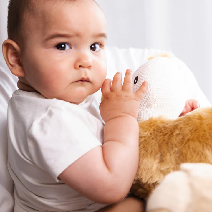 Beautifully crafted from mostly cotton with a pearl knit finish, they offer a lovely handcrafted feel. Each features a gentle rattle for playtime and comes with a sweet name label - perfect for cuddles, keepsakes, or gifting.