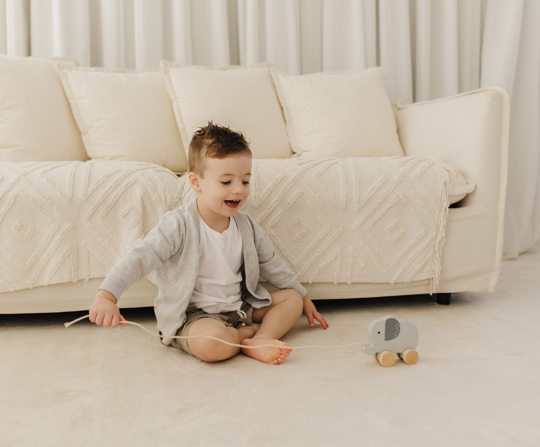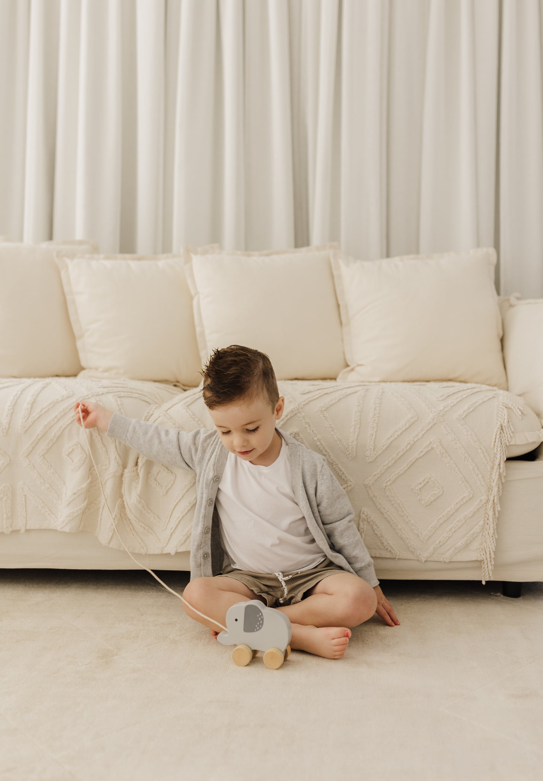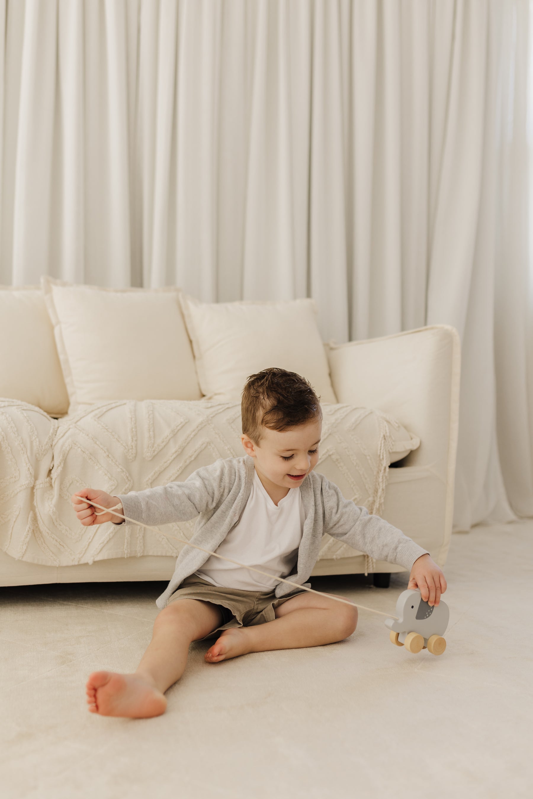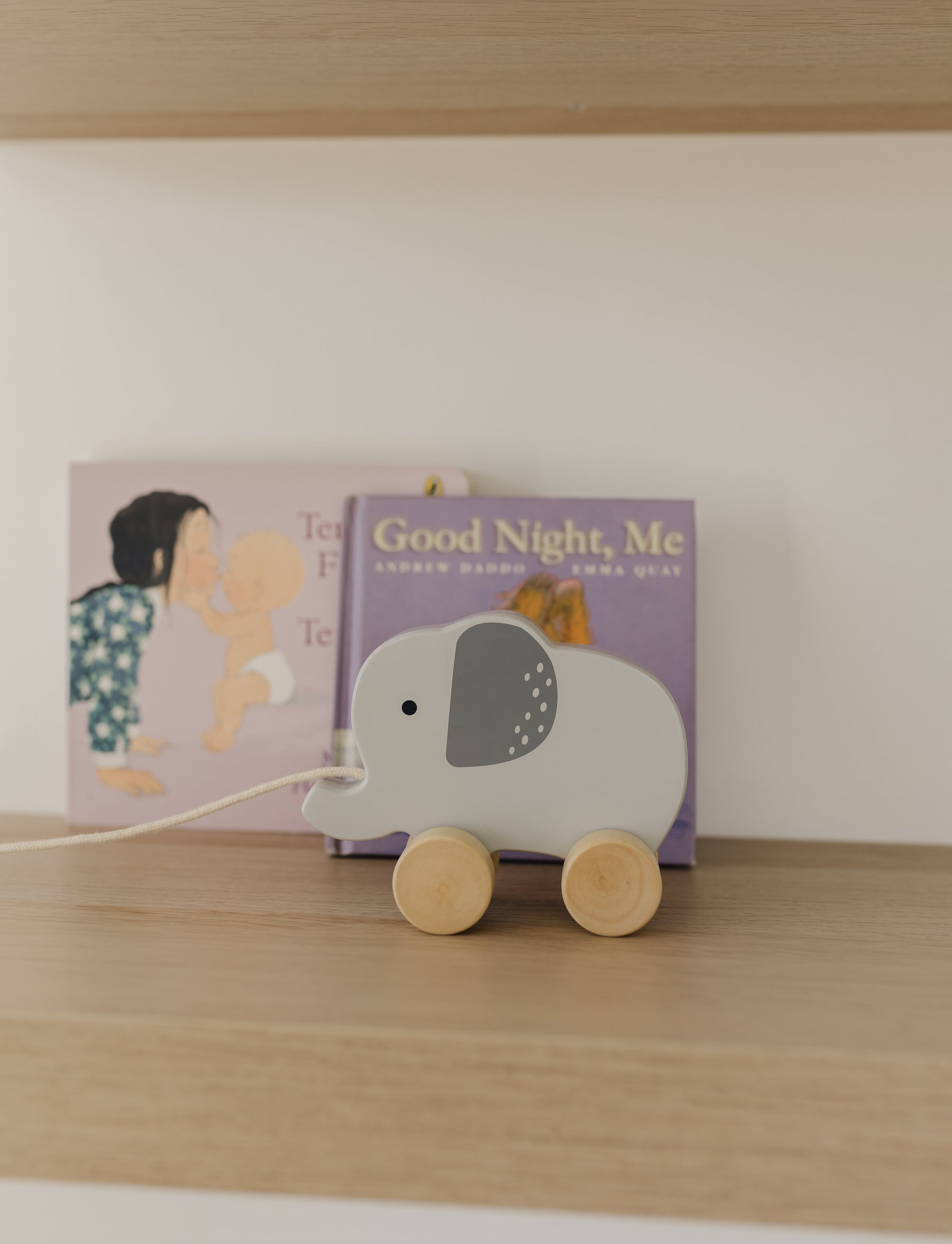Introducing the adorable Bubble Elephant Wooden Pull Along Toy - a charming grey, pull-along toy embodying timeless simplicity. This timeless treasure is designed to capture the hearts of both children and parents alike