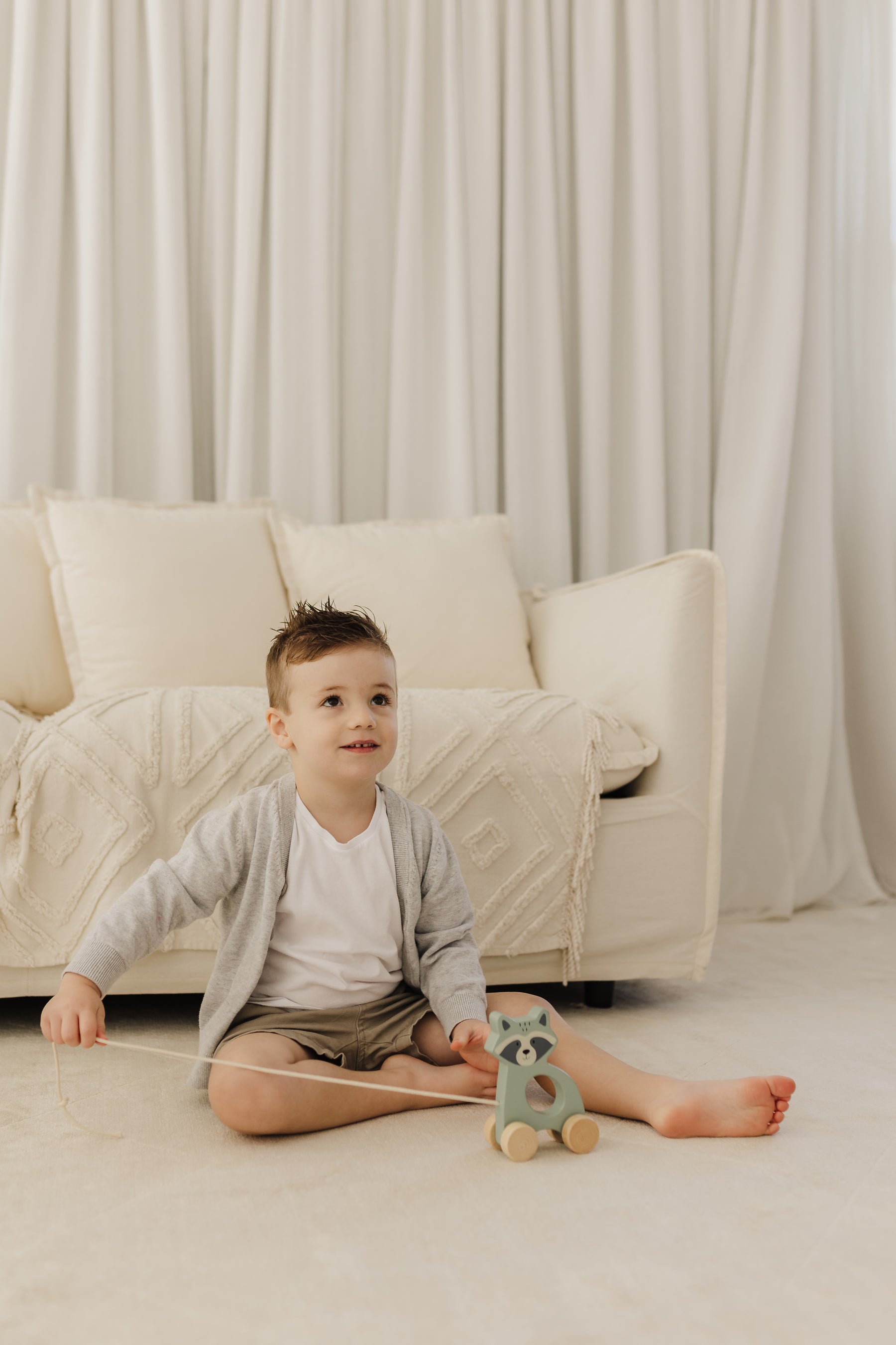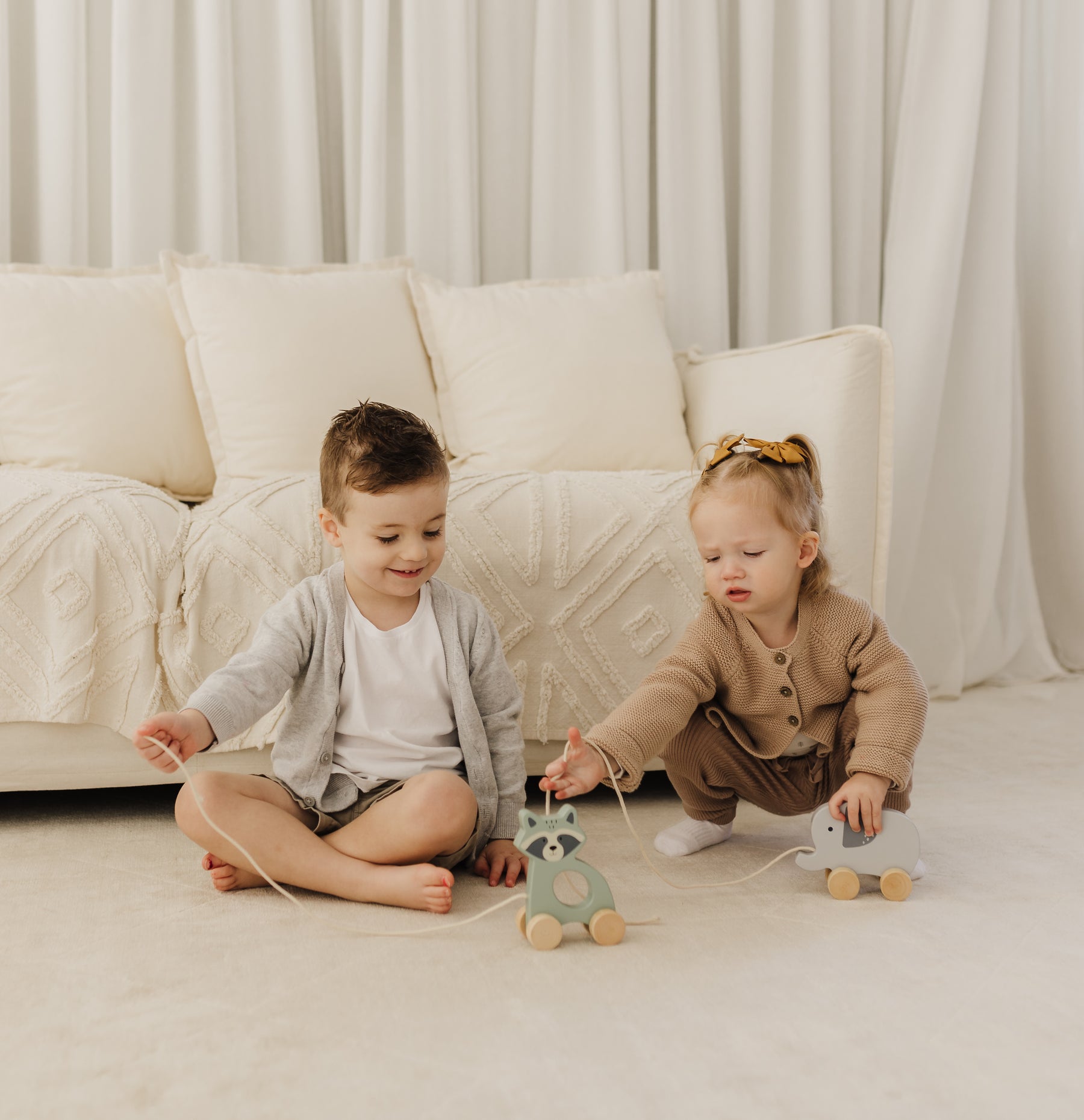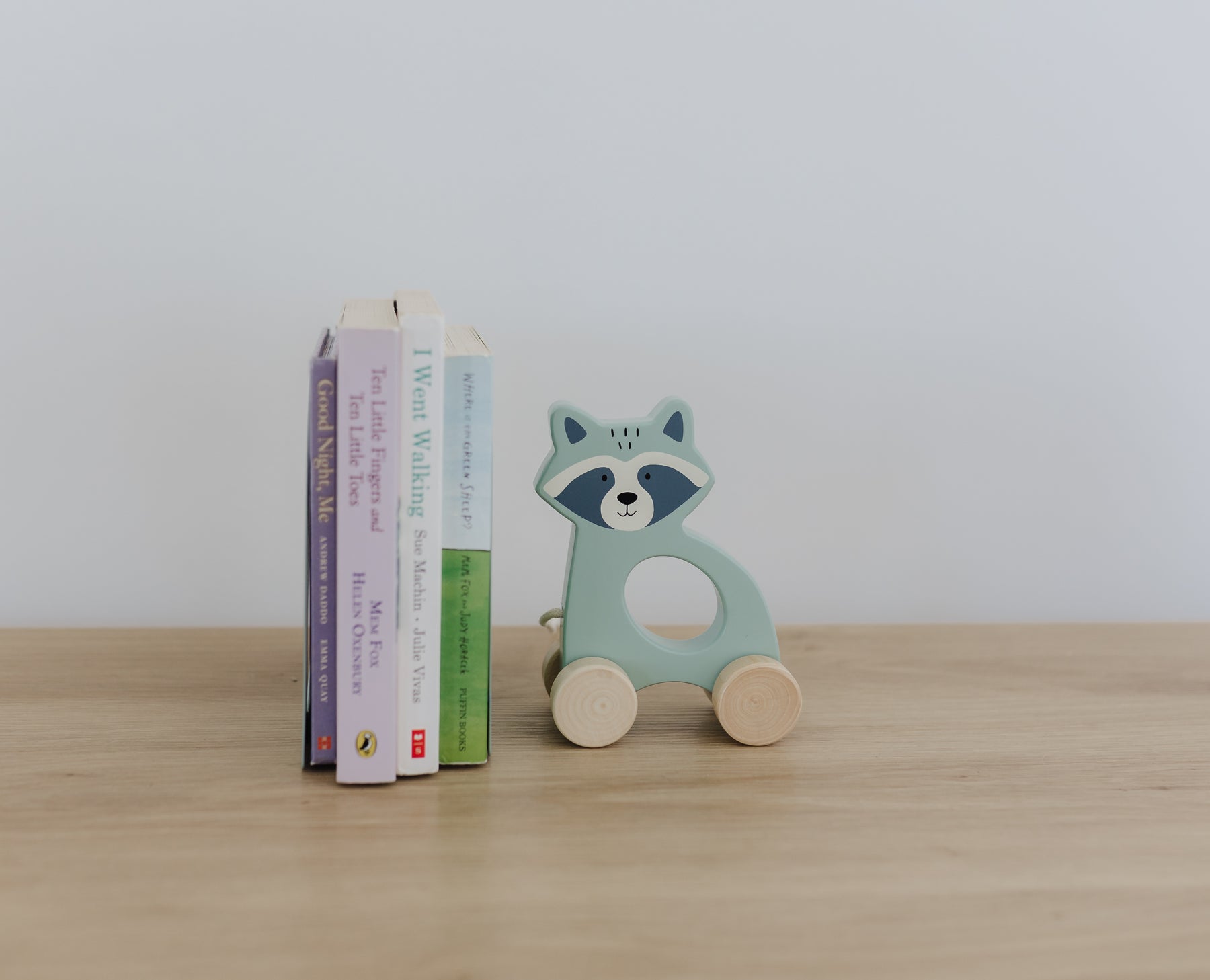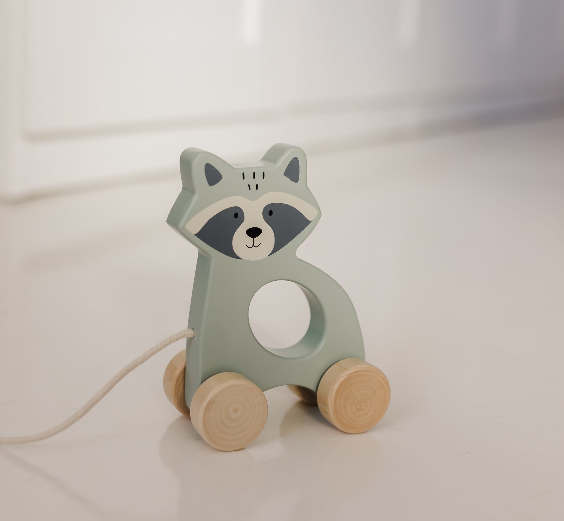 Introducing Bubble's delightful Bubble Raccoon Wooden Pull Along Toy - a charming green, pull-along toy embodying timeless simplicity. This timeless treasure is designed to capture the hearts of both children and parents alike.