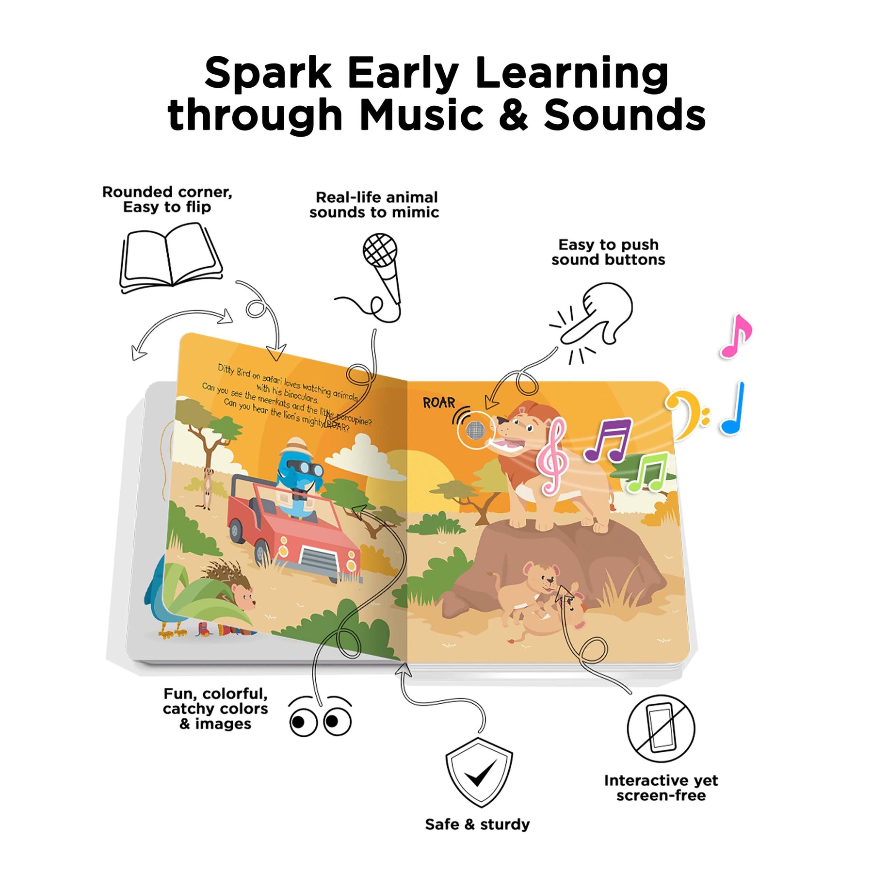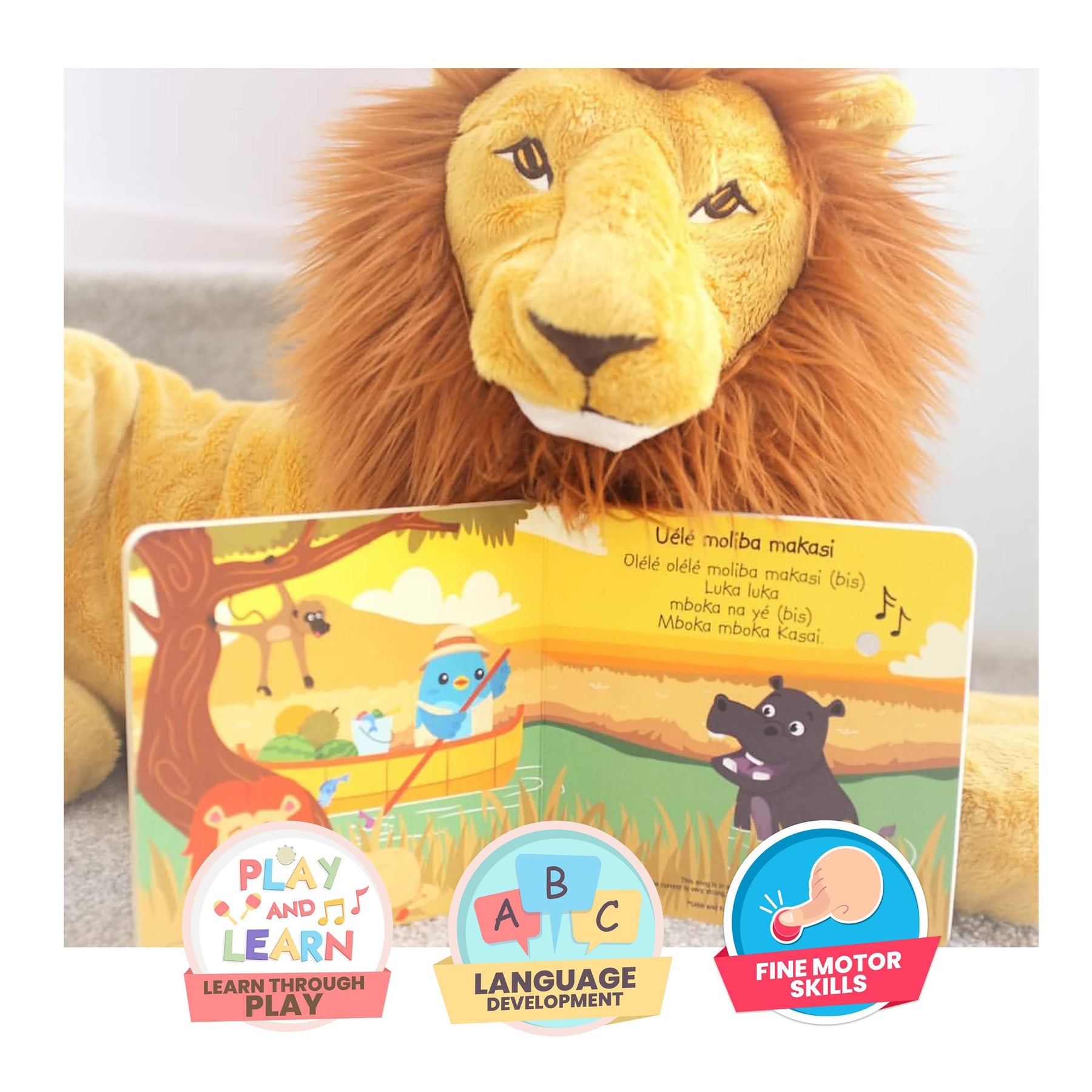 Let’s go on a jungle safari with a ditty bird to discover the sounds of African wild animals. A gentle touch of the ‘sound dot’ on each page will trigger real-life sounds of five favourite animals along with a song in Lingala!