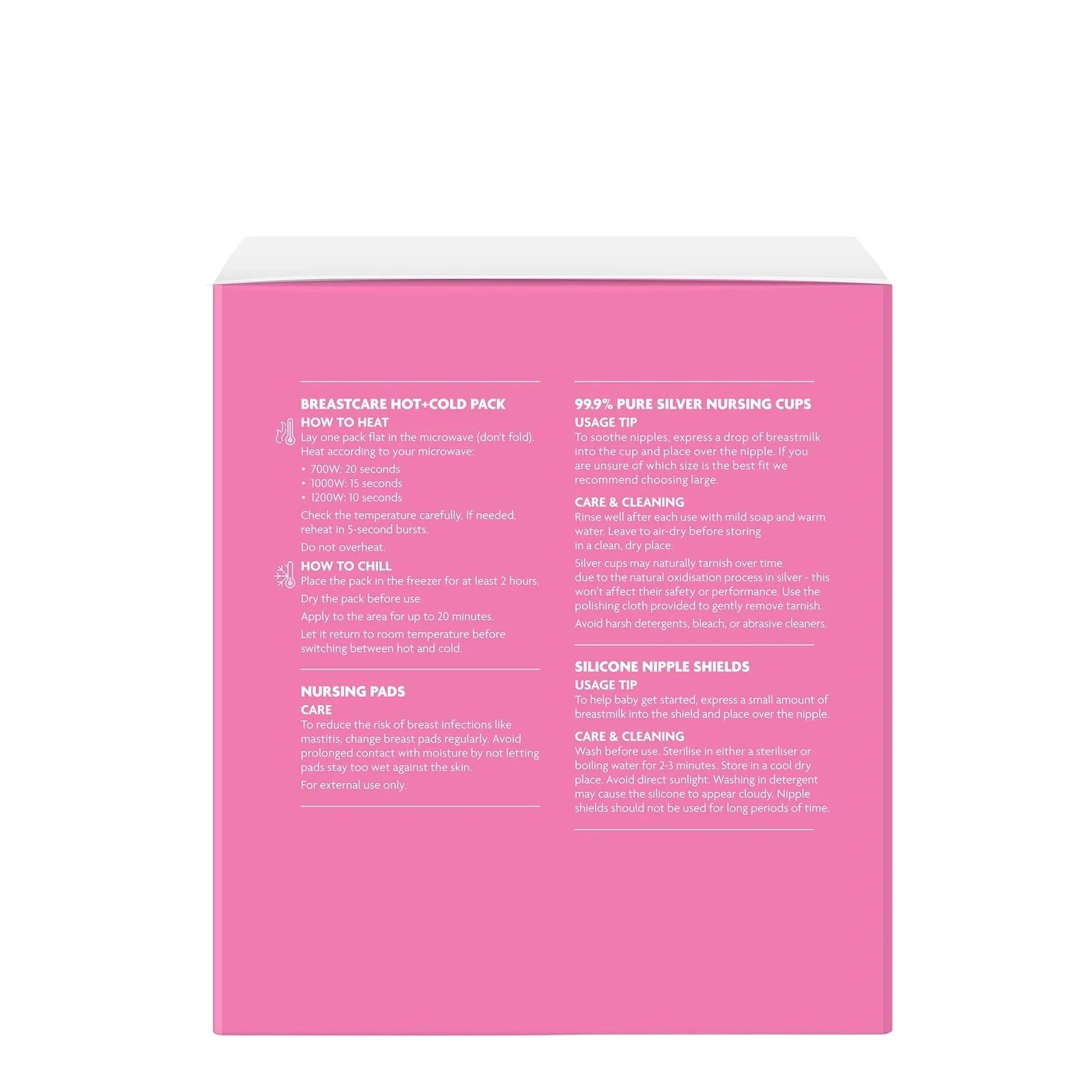 Breast care hot-cold packs can be used warm to stimulate milk flow or cold to relieve swelling and discomfort.
