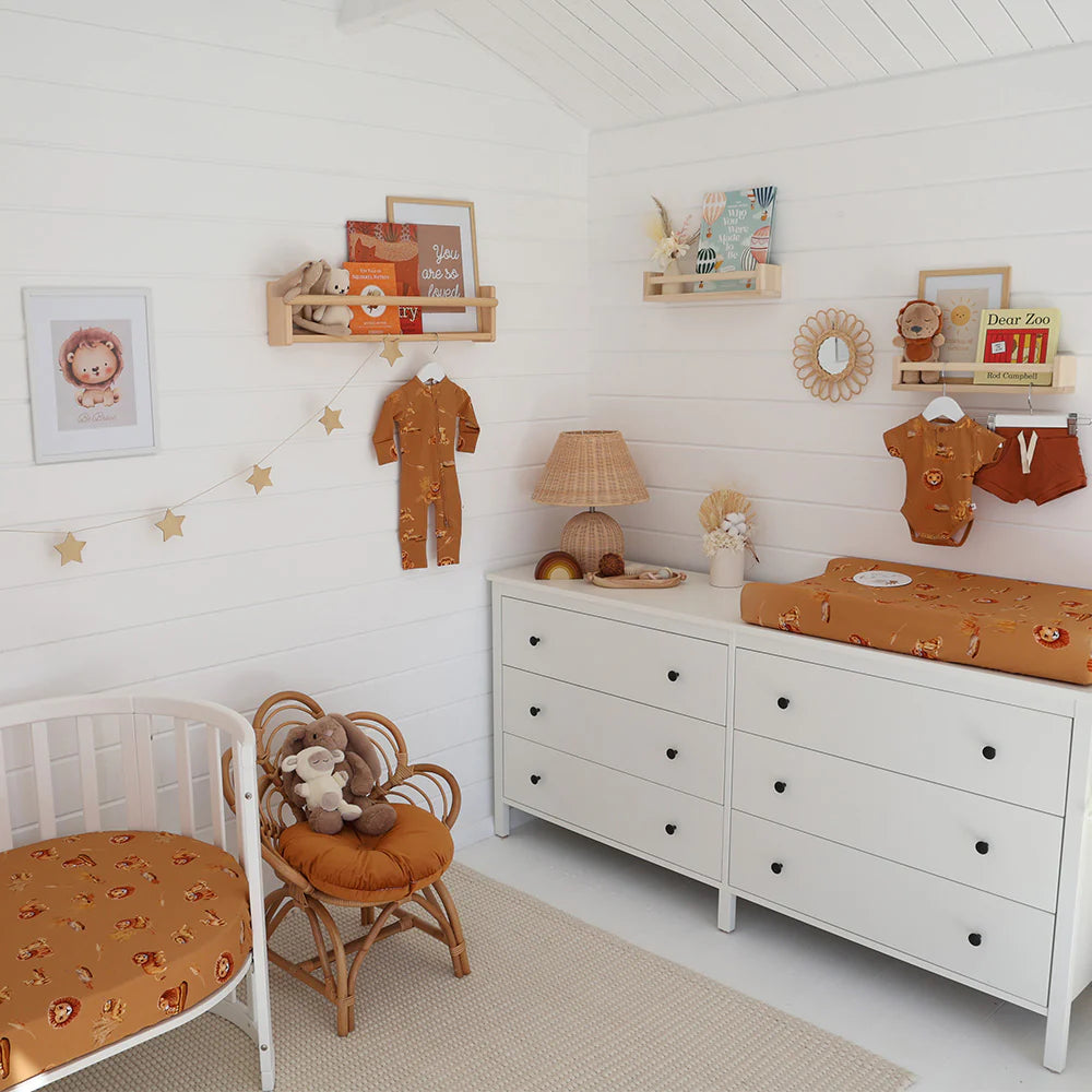 Snuggle Hunny Roar Fitted Bassinet Sheet doubles as a Change Pad Cover and is made from snuggly soft organic stretch cotton jersey. It is stretchy so fits most bassinet mattress sizes and comes in a matching drawstring bag.