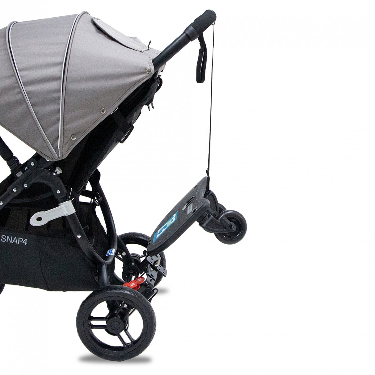 This ride-on easily clips to the rear of the pram, requiring only a rear axle, frame or horizontal bar to latch onto.